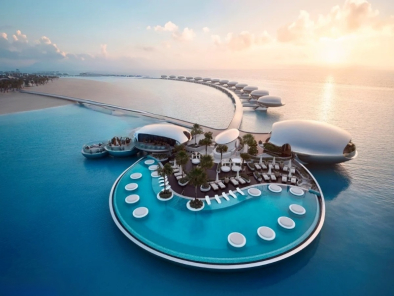 Overwater Villas – These futuristic floating suites come with private pools, glass floors, and endless ocean views. The design resembles scattered pearls on the sea.